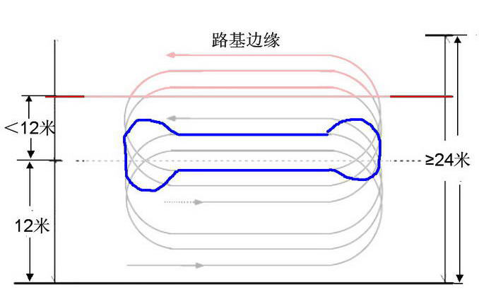 通過沖擊式壓路機“回形針環(huán)跑”路線一文中我們了解到,當路基寬度大于等于24米時,可采取“回形針環(huán)跑”路線(見下圖左),但是,當路基寬度小于24米時,沖擊式壓路機靠近中心位置時,就會出現(xiàn)調(diào)頭位置不夠的情況(見下圖右紅色標記處):