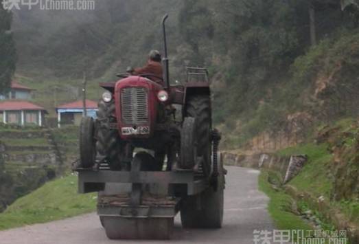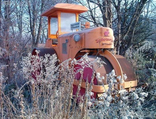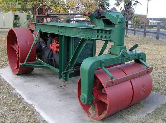 柴油動(dòng)力壓路機(jī)向近現(xiàn)代壓路機(jī)發(fā)展的路上,出現(xiàn)了很多大膽創(chuàng)意的壓路機(jī)。下圖便是一臺通過安裝在滾壓鋼輪上方的拖拉機(jī)來提供動(dòng)力的奇特壓路機(jī)。