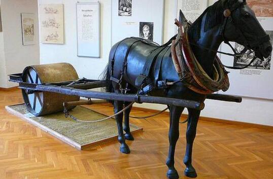 博物館里的十八世紀(jì)的馬拉鋼輪壓路設(shè)備復(fù)原模型