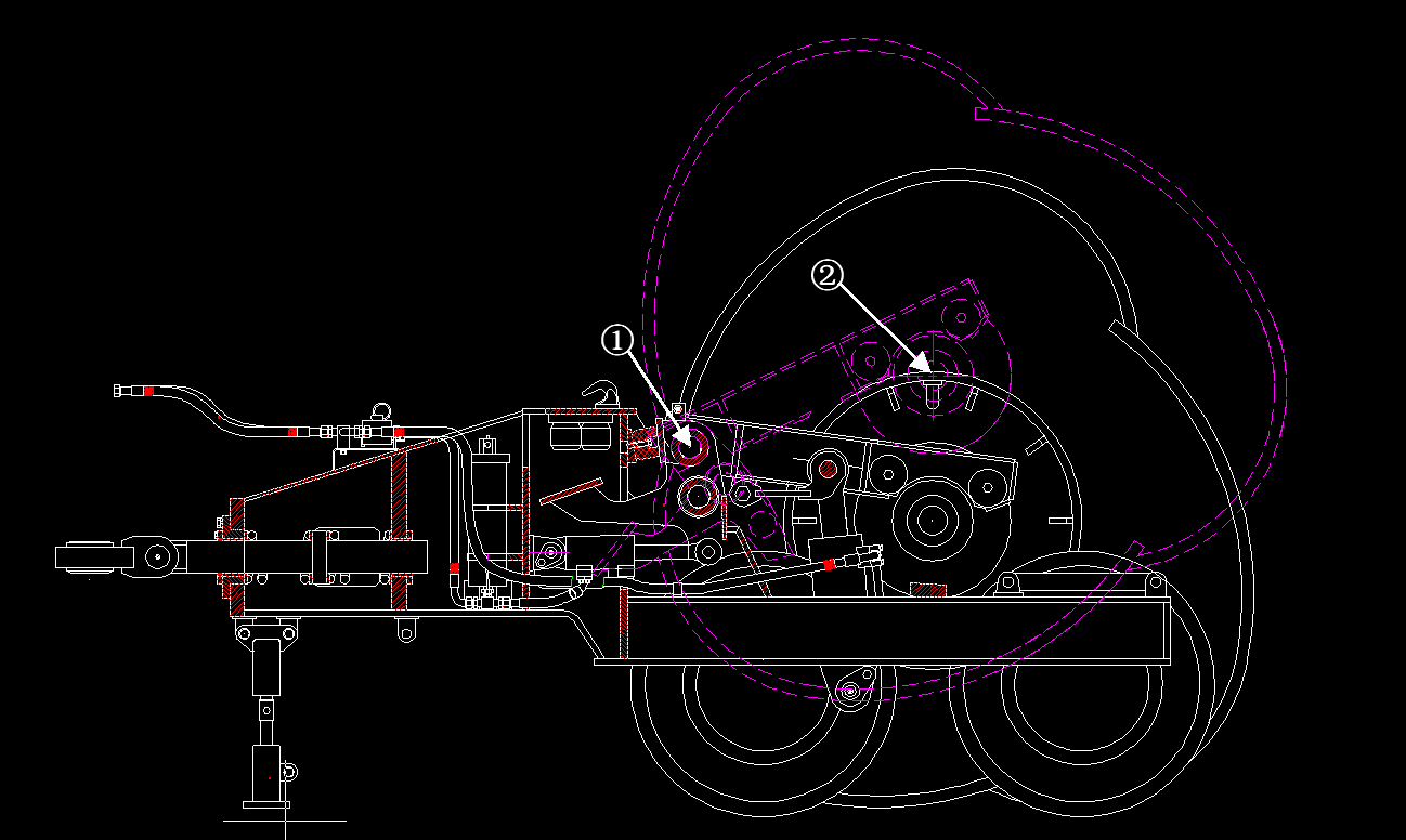 通過沖擊式壓路機設計圖紙(上圖),可以看到,當沖擊壓實輪向上舉起時,整個大輪包括軸管(千斤頂的支撐頂點)都是沿著一個弧度方向上升的(見圖2),加上千斤頂的支撐頂點(軸管)與千斤頂頂頭的接觸面很小,很容易滑脫,造成重大事故!