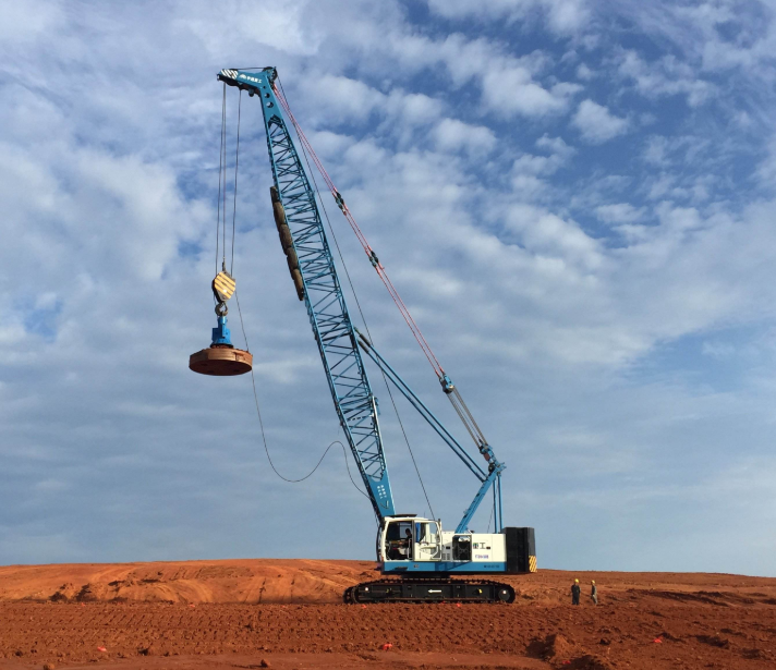強夯機采用強夯置換法加固飽和軟土地基。重錘的高跌落產(chǎn)生的高沖擊能量將具有更好性能的碎石,薄片,礦渣和其他材料擠壓到基礎(chǔ)中,形成一個顆粒狀的墩,墩和墩之間的土壤形成了一種復(fù)合地基,以改善基礎(chǔ)的承載力并減少沉降?! ?/font>