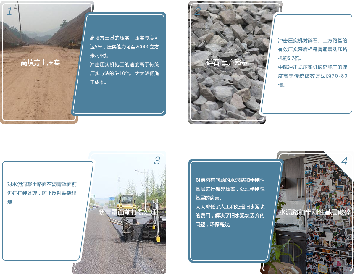 3、沖擊壓實(shí)機(jī)對(duì)碎石、土方路基的有效壓實(shí)深度相是普通震動(dòng)壓路機(jī)的5.7倍。